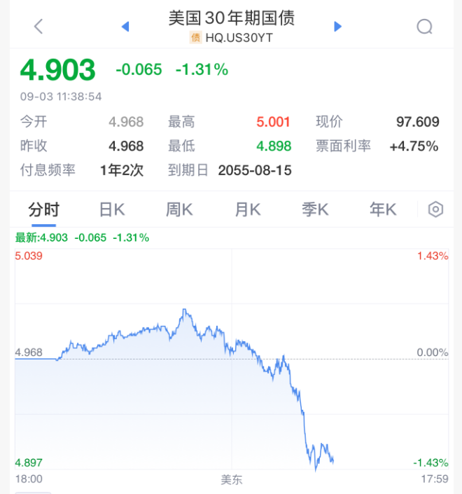 最新的数据推动市场押注2025年美联储至少降息两次。降息预期的飙升遏制了长期美债的抛售潮,此前30年期国债收益率一度接近5%,创7月以来最高水平。两年期国债收益率触及3.60%,为5月初以来最低。