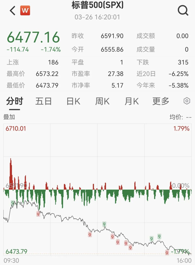3月26日,美国三大股指全线收跌,道指跌1.01%,报45960.11点;标普500指数跌1.74%,报6477.16点;纳指跌2.38%,报21408.08点。英伟达跌4.16%,3M公司跌2.72%,波音跌2.61%,领跌道指成份股。油价大涨,金价大跌