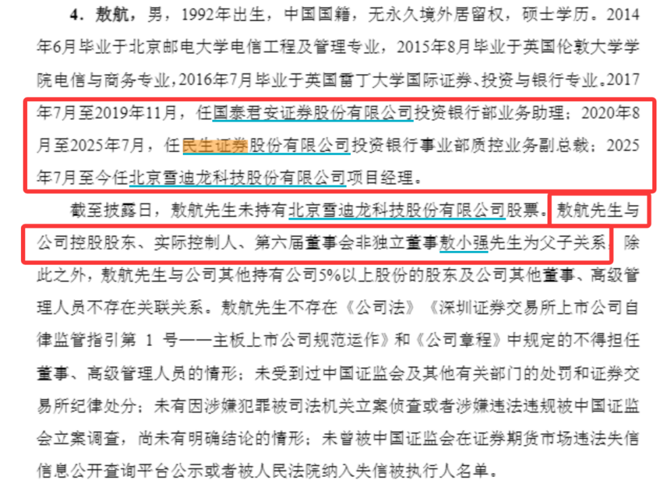公开资料显示,敖航,出生于1992年。2016年毕业后,从国泰君安证券投资银行部业务助理做起,2020年8月至2025年7月期间,升任民生证券投资银行事业部质控业务副总裁;2025年7月至今任雪迪龙项目经理。
