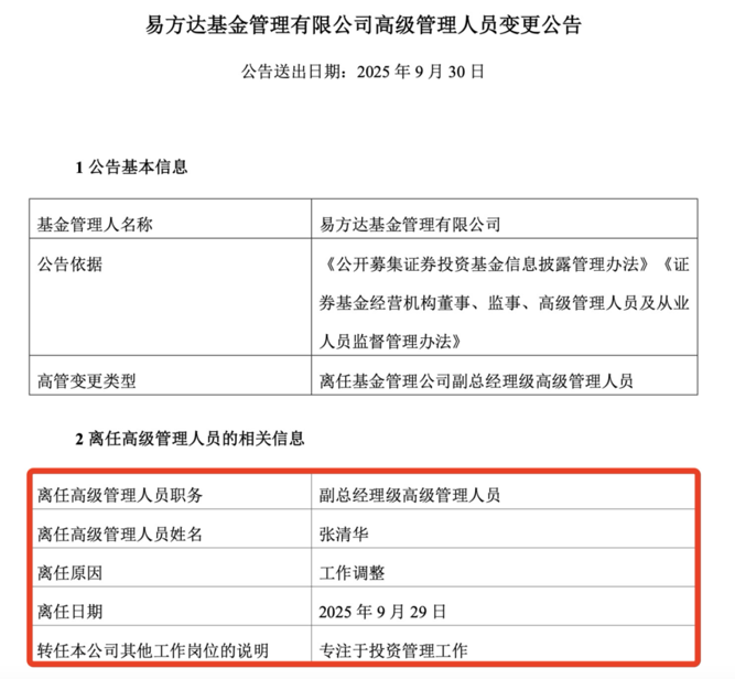 9月29日晚间,易方达基金公告,因工作调整,张清华不再担任副总经理,将专注于投资管理工作。