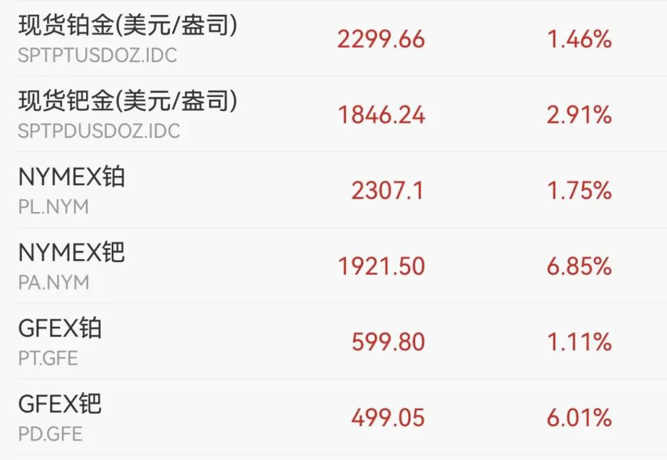 此外,NYMEX钯金主力合约涨超7%,现报1924.5美元/盎司。