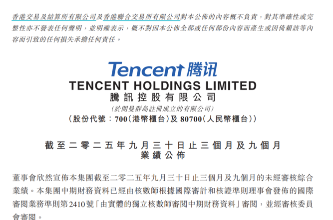 截至2025年9月30日,微信及WeChat的合并月活跃账户数达14.14亿,较上一财年同期增长2%。QQ的移动终端月活跃账户数为5.17亿,同比下降8%。收费增值服务订阅会员数稳定在2.65亿。四、国际市场游戏收入首次突破200亿元大关至208亿元本土市场游戏收入为人民币428亿元,同比增长15%,主要受益于近期发布的《三角洲行动》等多款游戏的收入贡献,《王者荣耀》与《和平精英》等长青游戏的收入增长,以及《无畏契约》从个人电脑端至移动端的拓展。国际市场游戏收入为人民币208亿元,同比增长43%(按固定汇率计算为42%),主要受益于Supercell旗下游戏的收入增长,新发布的个人电脑及主机游戏《消逝的光芒:困兽》的销量表现,以及近期收购的游戏工作室的收入贡献。第三季度的一般及行政开支同比增长18%至人民币342亿元,主要由于研发开支增加,特别是AI相关举措的投入。AI驱动的广告定向所带动的eCPM增长。本季所有主要行业的广告主投放均有所增长。企业服务收入同比增长十几个百分点,受益于云服务的收入增长(其中包括企业客户对AI相关服务需求上升带动的增长)。丰富了微信的AI功能,为用户提供新服务,并推动元宝更广泛地使用,取得了积极的成效。提升了混元大语言模型的复杂推理能力,尤其在编程、数学和科学等方面。根据LMArena的排名,混元图像生成模型在全球文生图模型中排名第一。六、马化腾表态