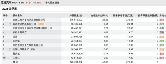 截至2025年三季度末,葛卫东亲属王萍新进成为江淮汽车的第五大股东,持股数量为2350.17万股;葛贵莲增持至1661.62万股,占总股本的0.76%。