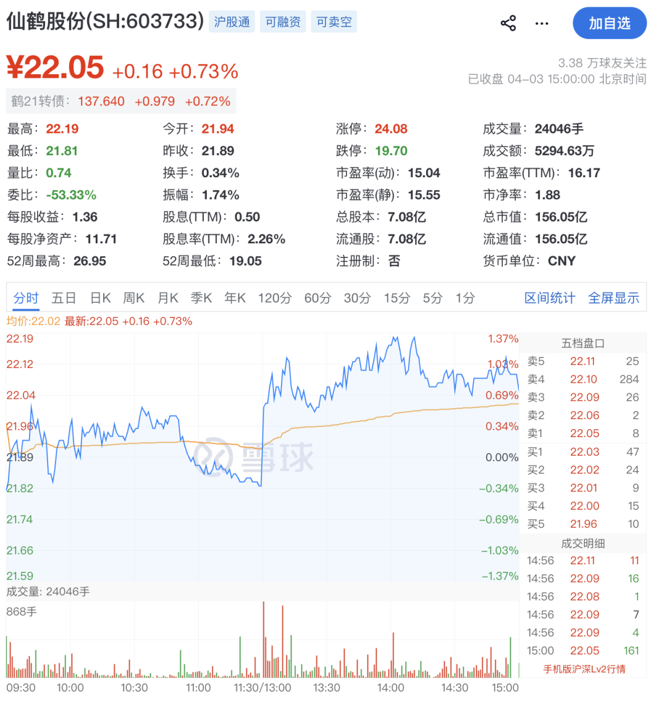 截至4月3日收盘,仙鹤股份股价报22.05元/股,总市值为156亿元。