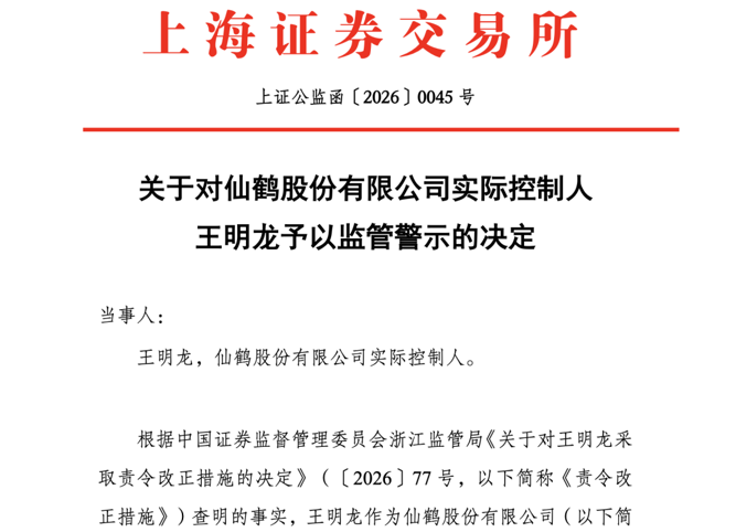 此外,上交所对仙鹤股份实际控制人之一王明龙予以监管警示。