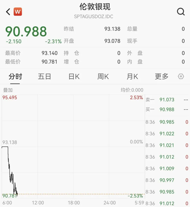 现货白银跌超2%