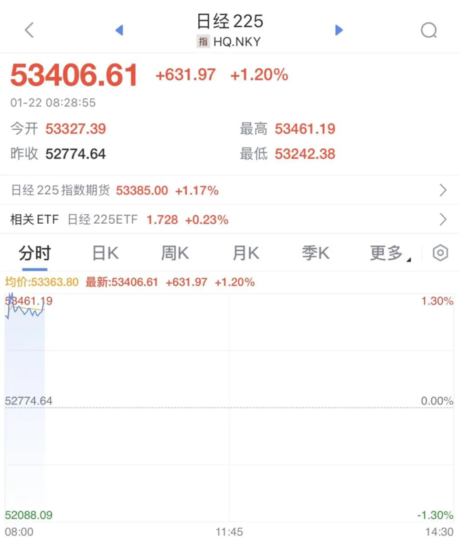 日经225指数震荡走高,涨超1%,现报53406.61点。