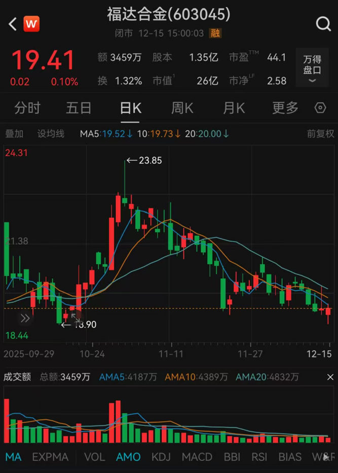 截至12月15日收盘,福达合金报19.41元/股,与10月末的高位相比跌幅超14%,公司最新市值为26亿元。