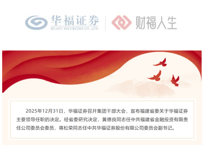 根据华福证券官微发布,2025年12月31日,华福证券召开集团干部大会,宣布福建省委关于华福证券主要领导任职的决定。经省委研究决定,黄德良同志任中共福建省金融投资有限责任公司委员会委员,蒋松荣同志任中共华福证券股份有限公司委员会副书记。