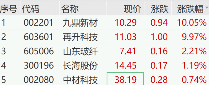 另外,上午玻璃纤维概念股持续活跃,九鼎新材、再升科技涨停。