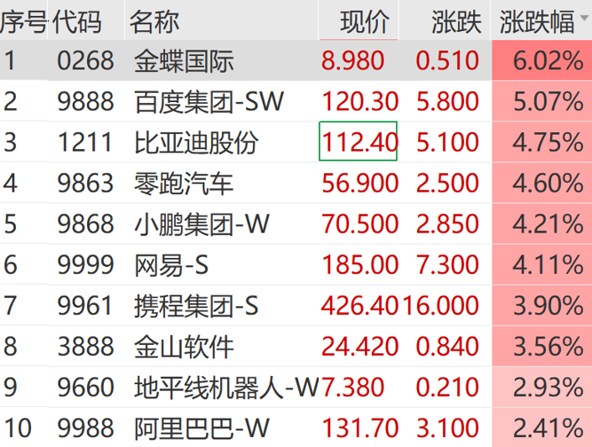 港股同步走强,恒生科技指数大涨超2%,金蝶国际、百度集团、比亚迪股份等领涨恒生科技指数成份股。
