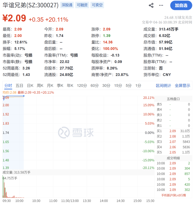 4月16日,华谊兄弟竞价涨停,报2.09元/股;开盘后短暂开板,但迅速回封涨停。截至发稿,买一达31万手。