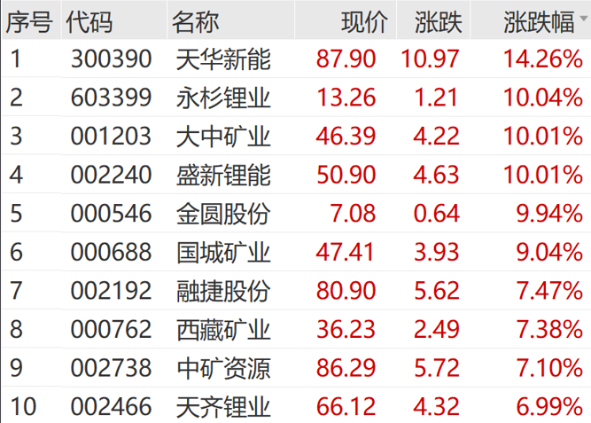 锂矿指数直线拉升,大中矿业、盛新锂能、金圆股份等涨停,天华新能涨超10%,国城矿业、融捷股份等跟涨。