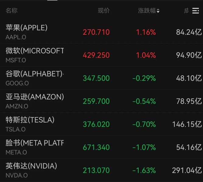 美股科技“七巨头”中,苹果和微软涨超1%,英伟达下跌1.63%,脸书跌超1%,特斯拉、亚马逊、谷歌均收跌。
