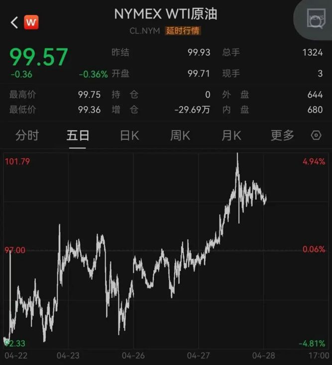 周二,NYMEX WTI原油期货走势震荡,最新价格位于100美元/桶附近。