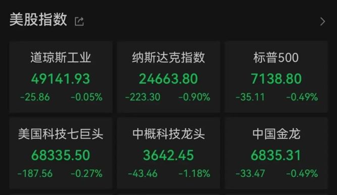 截至收盘,美股三大指数集体收跌,道琼斯指数跌0.05%,报49141.93点;标普500指数跌0.49%,报7138.8点;纳斯达克综合指数跌0.9%,报24663.8点。