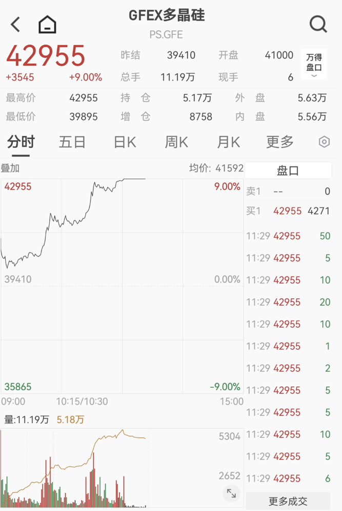 4月20日上午,广期所多晶硅主力合约盘中持续拉升,午前涨幅达到9%,报42955元/吨,成功封住涨停板。