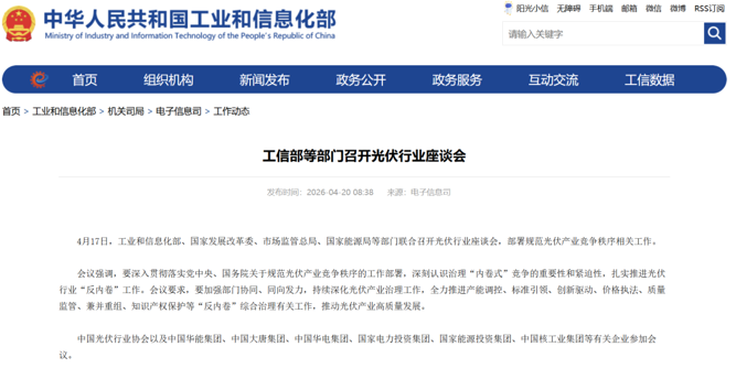 据工信部消息,4月17日,工业和信息化部、国家发展改革委、市场监管总局、国家能源局等部门联合召开光伏行业座谈会,部署规范光伏产业竞争秩序相关工作。