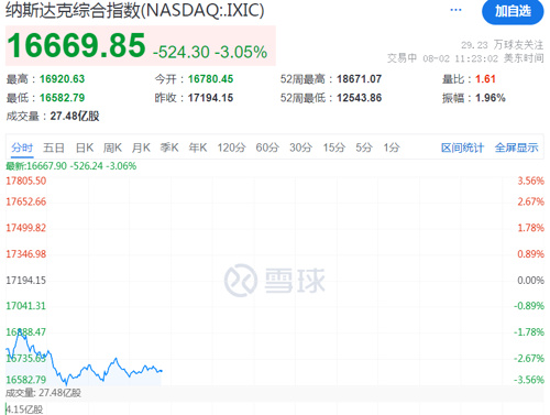 今晚的美股遭遇罕见暴跌。其中,道指暴跌超900点,纳指暴跌超3%!周五的抛售将纳斯达克指数推入回调区间,纳指较近一个月前创下的历史高点下跌逾10%。标普500指数和道琼斯指数分别较历史高点下跌6%和4%。