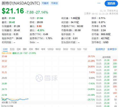 英特尔盘中暴跌近30%,创下自1982年以来的最大跌幅。