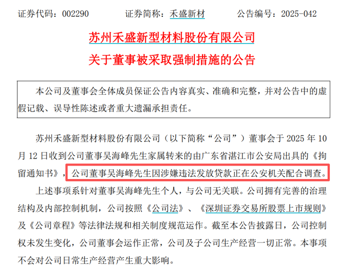 10月13日晚间,上市公司禾盛新材公告称,其董事会收到董事吴海峰家属转来的由广东省湛江市公安局出具的《拘留通知书》,吴海峰因涉嫌违法发放贷款正在公安机关配合调查。