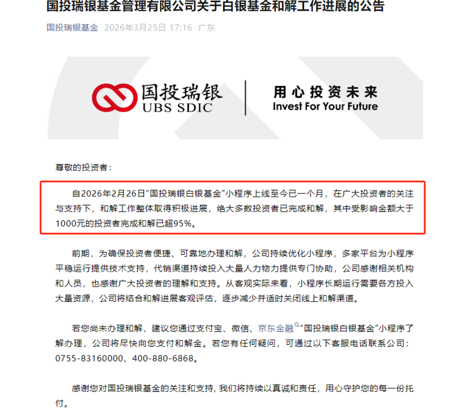 国投瑞银公告,揭开“国投瑞银白银基金”小程序上线一个月的最新进展,绝大多数投资者已完成和解。
