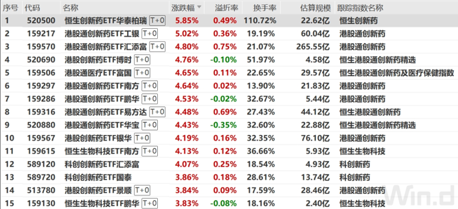 紧随其后的是港股通创新药ETF工银、港股通创新药ETF汇添富,单日涨幅分别为5.02%、4.80%,成交额分别为11.81亿元、57.76亿元。