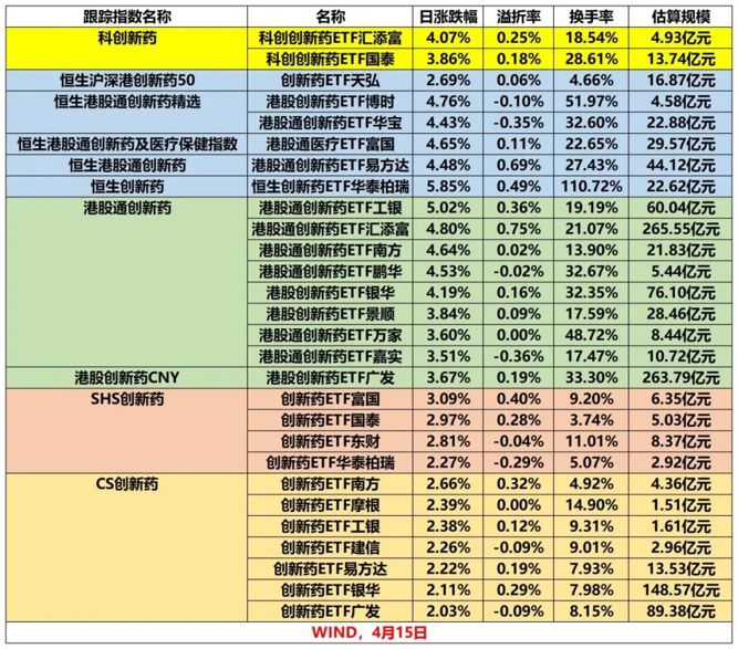 4月15日,创新药板块强势领涨,相关ETF“霸屏”,恒生创新药ETF华泰柏瑞涨5.85%,领涨全市场。