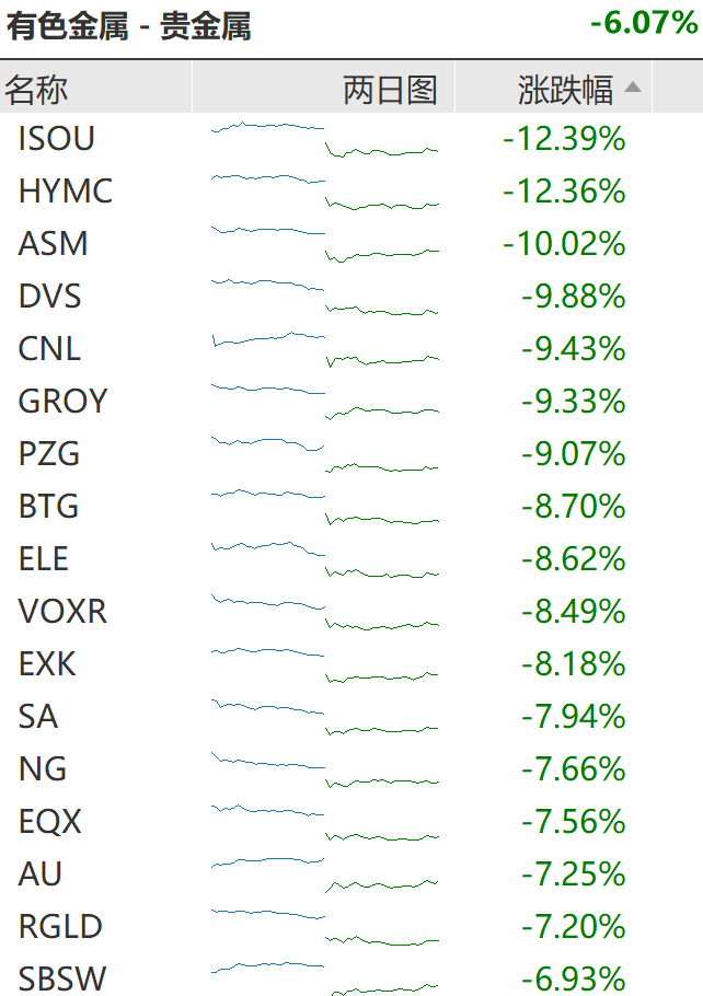 贵金属股集体跳水,盎格鲁黄金跌超7%,泛美白银跌逾6%,埃尔拉多黄金跌超6%,哈莫尼黄金跌逾6%,巴里克黄金跌超5%。