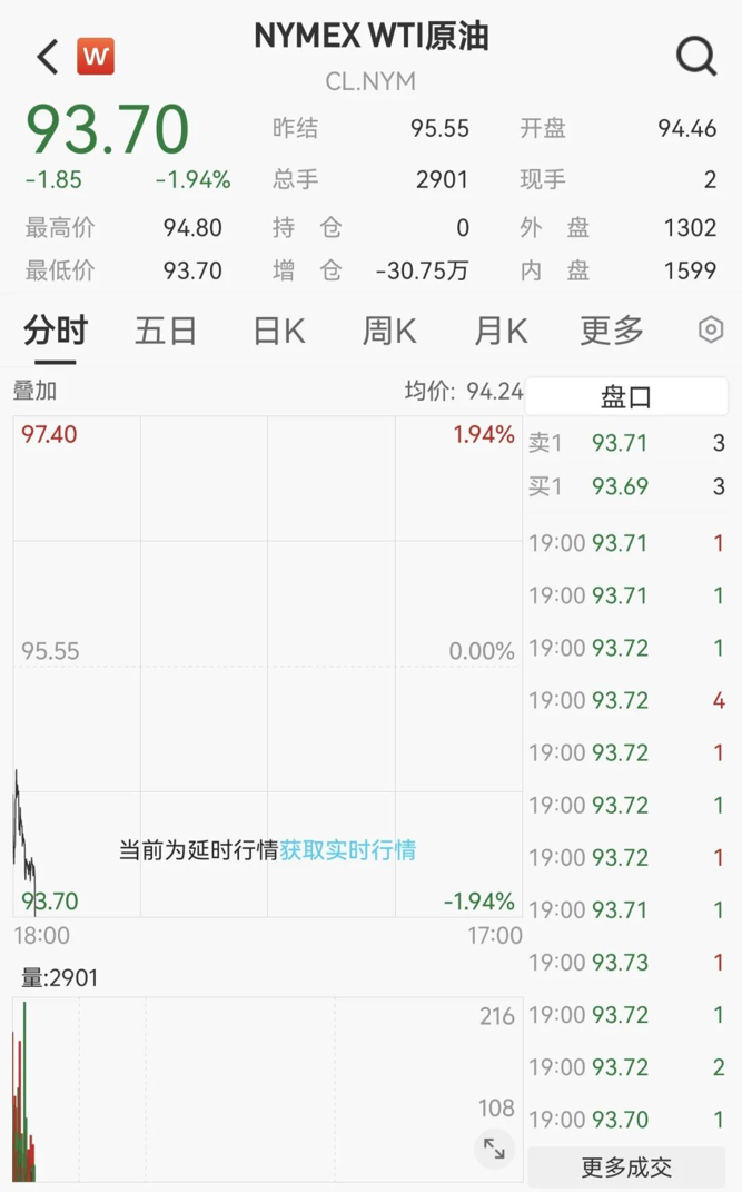 盘后WTI原油期货主力合约进一步下跌,截至发稿,跌1.94%,报93.70。