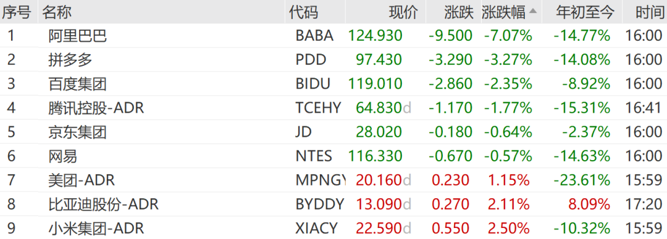 阿里巴巴跌7.07%,拼多多跌3.27%,百度集团跌2.35%,领跌万得中概科技龙头指数成份股。