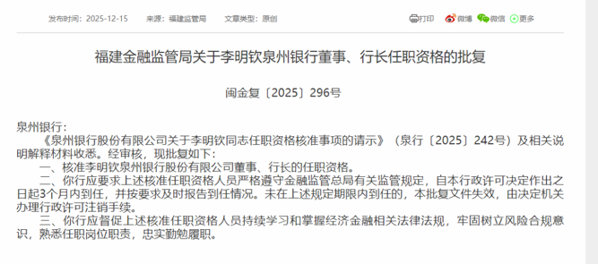 福建金融监管局批复公告显示,核准李明钦泉州银行董事、行长的任职资格。同时,该局要求,上述核准任职资格人员严格遵守金融监管总局有关监管规定,自行政许可决定作出之日起3个月内到任,并按要求及时报告到任情况。