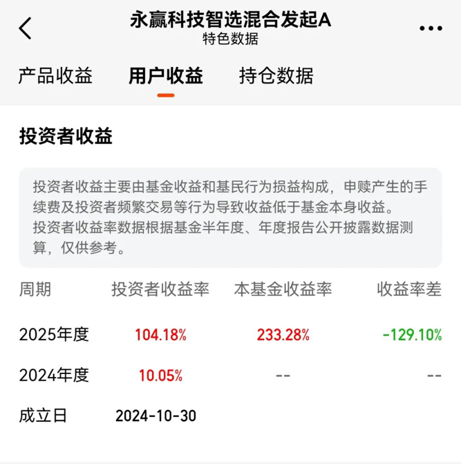更为值得关注的是,并列展示的“基金收益率”及“投资者收益率”揭开了投资者的真实收益差(投资者收益率-基金收益率)。例如,永赢科技智选2025年的投资者收益差为-129.10%,这也意味着该基金2025年收益率高达233.28%,而投资者收益率只有104.18%,差距不止一倍。