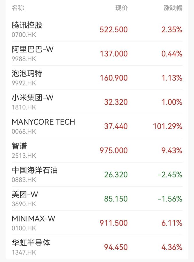 【导读】港股三大指数集体收涨!AI应用股群核科技暴涨超101%!商业航天、光伏板块走强