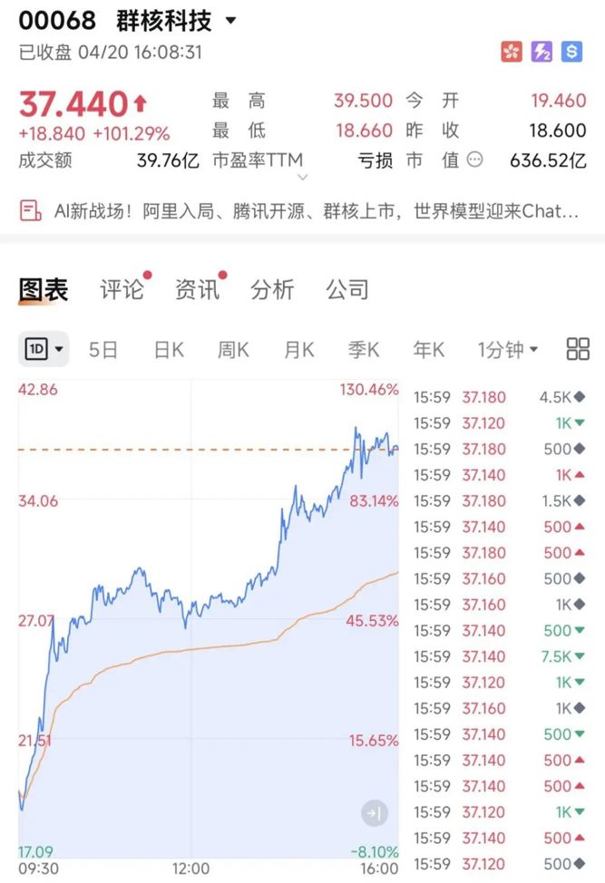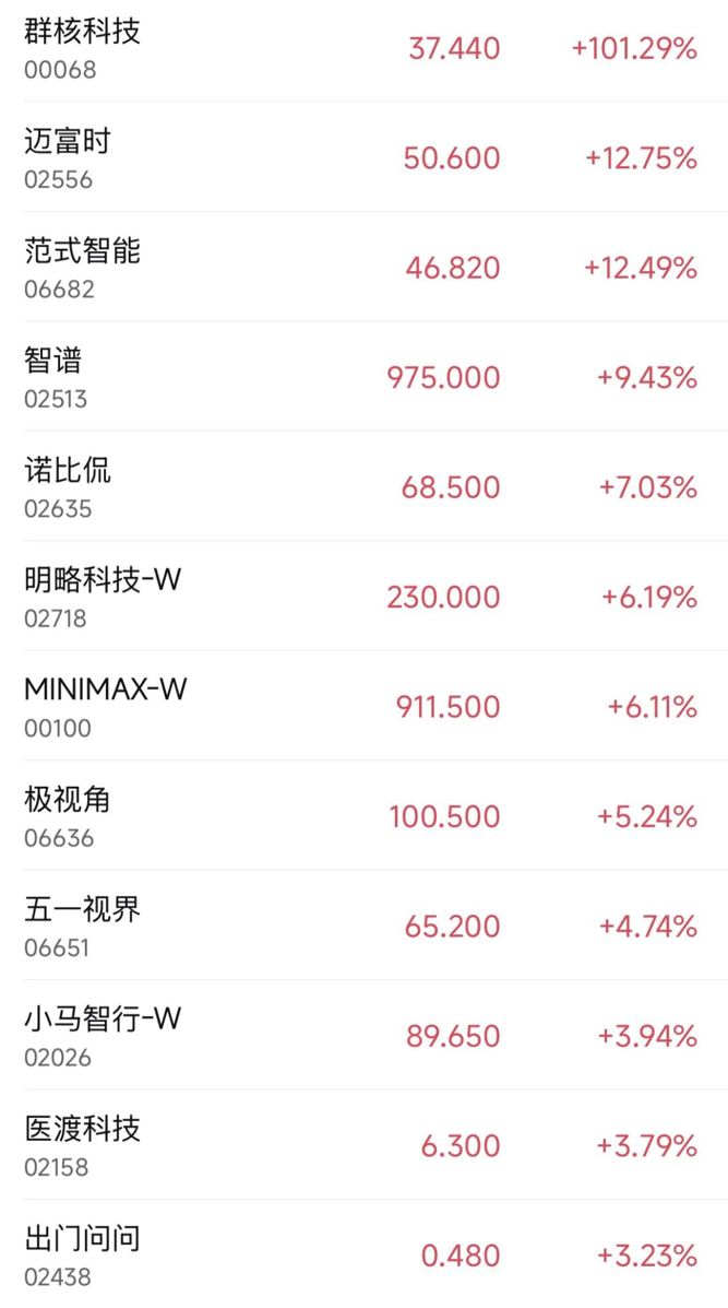 4月20日,港股AI应用股板块走高,其中群核科技大涨超101%,盘中一度涨超110%;迈富时、范式智能涨超12%,智谱涨超9%,MiniMax涨超6%。