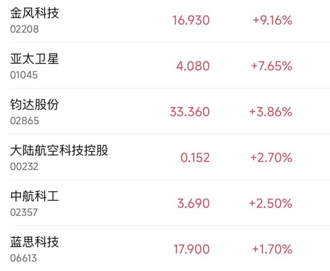 4月20日,港股商业航天板块强势,其中金风科技涨超9%,亚太卫星、钧达股份、中航科工、蓝思科技等跟涨。