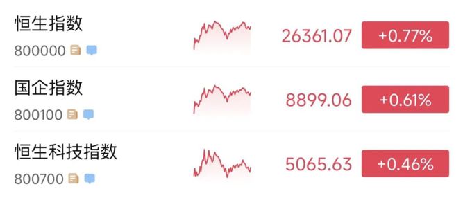 4月20日,港股高开后震荡走高,最终三大指数集体上涨。截至收盘,恒生指数涨0.77%,报26361.07点;恒生国企指数涨0.61%,报8899.06点;恒生科技指数涨0.46%,报5065.63点。