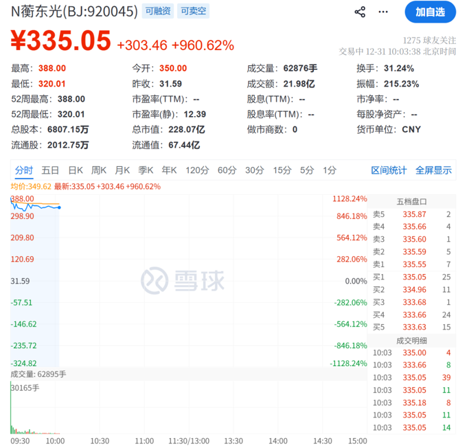 12月31日,蘅东光正式登陆北交所市场,开盘报350元/股,涨幅为1007.95%;盘初涨幅最高达到1128.24%。截至发稿,蘅东光报335.05元/股,涨幅为960.62%。