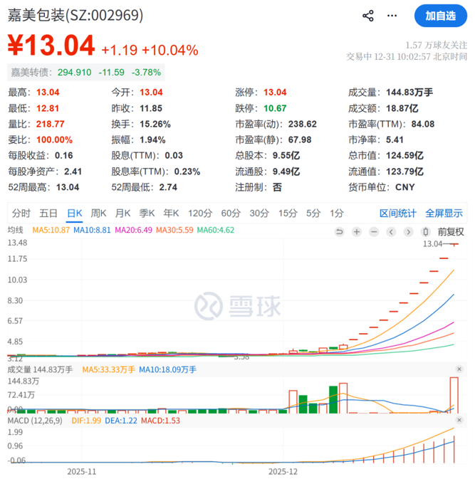 12月31日,嘉美包装在竞价阶段即涨停,报13.04元/股,实现11连板。截至发稿,嘉美包装仍保持涨停状态。