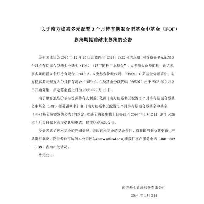 2026年2月2日晚间,南方基金发布公告,称南方稳嘉多元配置3个月持有混合型基金中基金(FOF)(以下简称“南方稳嘉多元配置3个月持有混合(FOF)”,A类代码:026596,C类代码:026597)提前结束募集。