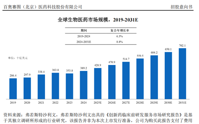2024年,全球生物医药市场规模达到约3892亿美元。弗若斯特沙利文估计,全球生物医药市场的规模将在2031年增长至7021亿美元。