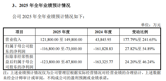 招股意向书显示,受AI蓬勃发展及国产化进程加速的影响,摩尔线程预计其2025年全年的营业收入为12.18亿元至14.98亿元,同比增长177.79%至241.65%;归母净利润为-11.68亿元至-7.30亿元,同比增长27.82%至54.89%。