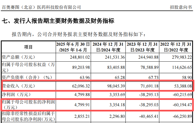 2022年至2024年及2025年上半年,百奥赛图的营业收入分别为5.34亿元、7.17亿元、9.80亿元及6.21亿元,归母净利润分别为-6.02亿元、-3.83亿元、3354.18万元及4799.91万元。