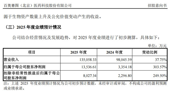 招股意向书显示,基于海外市场开拓和国内生物医药企业释放更多的研发需求,百奥赛图预计其2025年全年的营业收入为13.51亿元,同比增长37.75%;归母净利润为1.35亿元,同比增长303.57%。