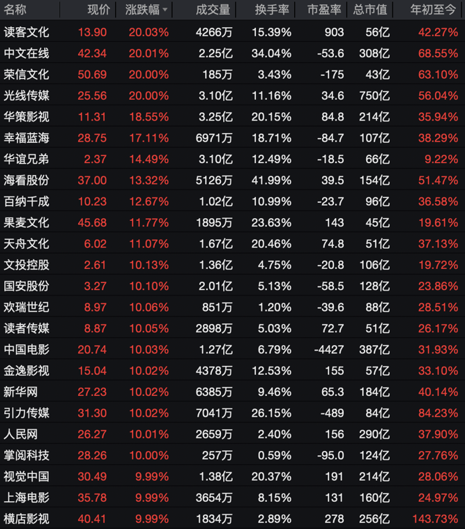 AI应用方向集体爆发,文化传媒、短剧游戏、互联网等板块涨幅居前,十余股纷纷涨停。其中,读客文化、中文在线、光线传媒、荣信文化均实现20%涨停,欢瑞世纪、中国电影、金逸影视等多股涨停,人民网开盘一分钟涨停。