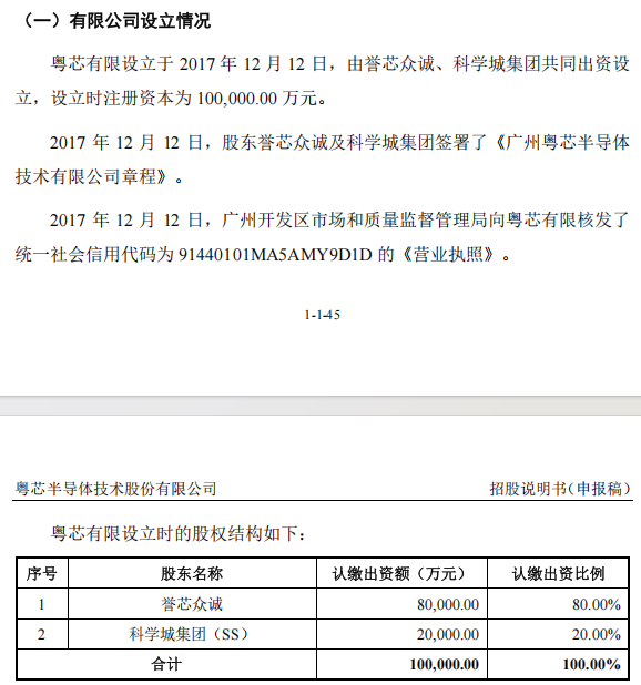 招股书(申报稿)显示,粤芯半导体当前无控股股东和实际控制人,创始股东是广州誉芯众诚股权投资合伙企业(有限合伙)(以下简称誉芯众诚)、科学城(广州)投资集团有限公司(以下简称科学城集团)。