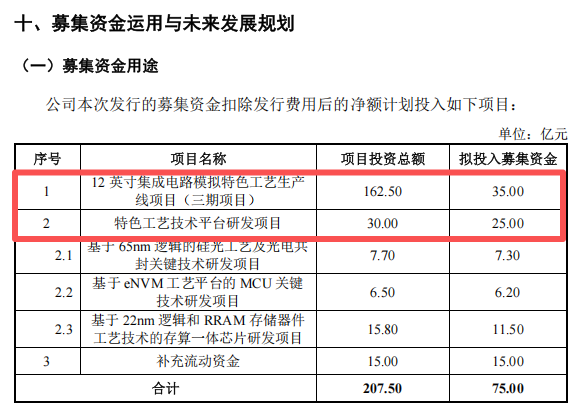 招股书(申报稿)显示,粤芯半导体申报深交所创业板IPO拟募资75亿元,其中35亿元用于12英寸集成电路模拟特色工艺生产线项目(三期项目)、25亿元用于特色工艺技术平台研发项目,合计占拟募资总额的80%。