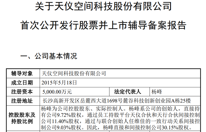 辅导报告显示,天仪空间成立于2015年5月18日,注册资本为5000万元,控股股东和实际控制人均是杨峰,合计控制30.15%的股份。