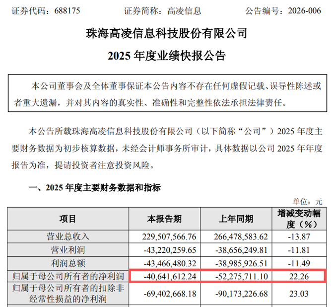 业绩快报显示,高凌信息2025年的营业收入为2.30亿元,同比下降13.87%;归母净利润为-4064.16万元,亏损同比收窄22.26%。
