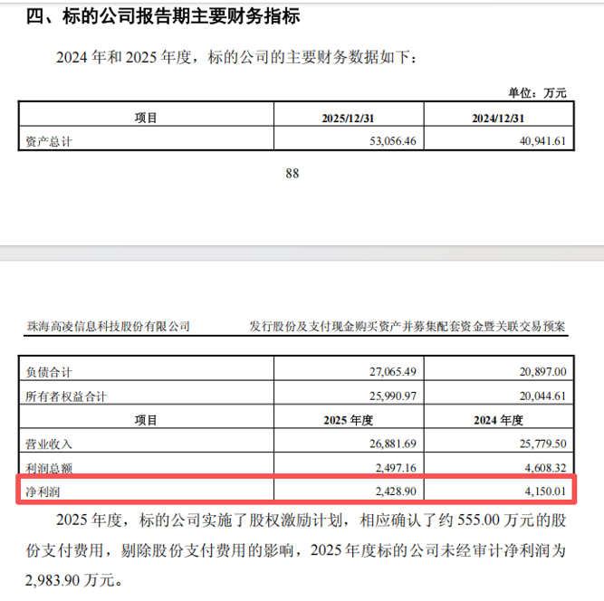 交易预案显示,凯睿星通在2025年实施股权激励计划,确认了约555.00万元股份支付费用,剔除股份支付费用影响后未经审计的2025年净利润为2983.90万元。